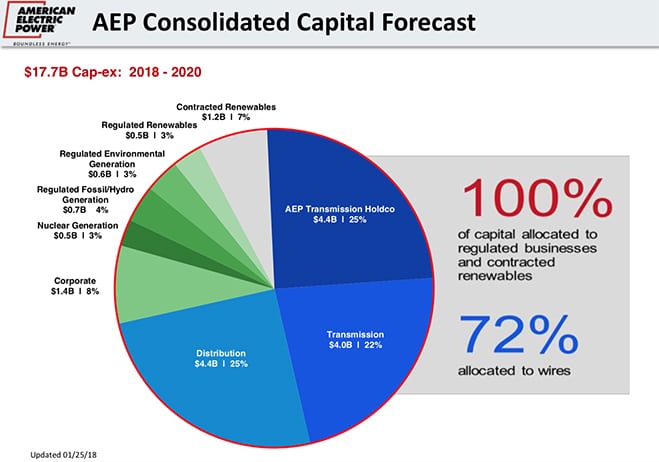 AEP’s capex will “largely be spread across our business, but our interest in terms of how we allocate capital, transmission is still a preferred place for us to put capital, distribution and the wire side is still a preferred place for us to put capital, and there will be small portions associated with competitive renewable and some portion still associated with environmental at our generation,” Brian Tierney, AEP’s chief financial officer, said in a fourth-quarter 2017 earnings call on January 25.