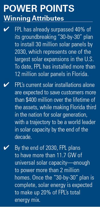 Valle said the 42 operating solar energy centers represent 3,015 MW of generation capacity. “Combined, our solar fleet consists of over 12 million photovoltaic [PV] solar panels and can generate enough energy to power more than 600,000 homes annually,” Valle said. “Once our ‘30-by-30’ plan is complete, solar energy is expected to make up 20% of FPL’s total energy mix.”