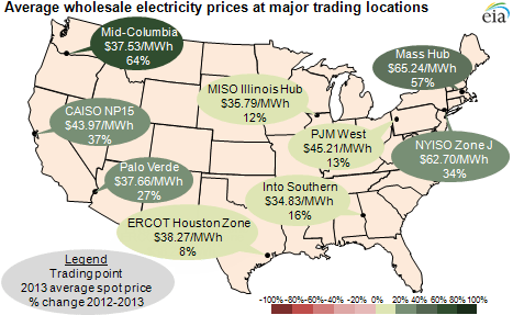Between 2014 and 2013, wholesale on-peak power prices were up at trading hubs owing to increases in spot natural gas prices and high energy demand caused by the polar vortex at the beginning of 2014.