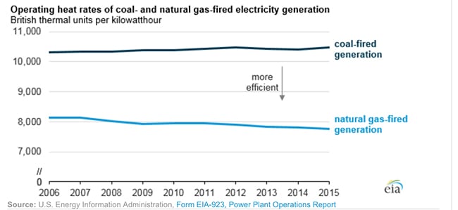 By 2015, the average heat rate for natural gas–generation (7,878 Btu/kWh) was about 25% lower than the average heat rate for coal generators, which had gone up to 10,495 Btu/kWh.