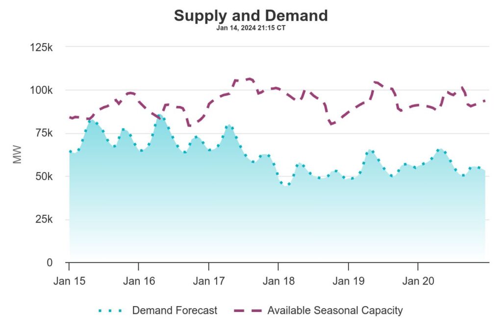 Nearly 74 GW of generation resources are available, including 1,984 MW of mothballed capacity. Generators of the shuttered plants had notified the grid operator that they planned to bring these plants back online to meet high summer demand.