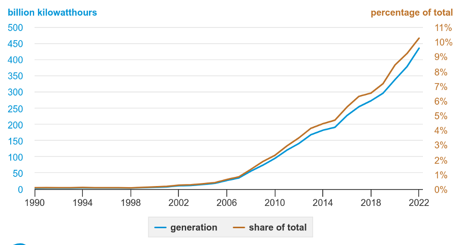 1. Wind electricity generation and share of total U.S. electricity generation, 1990–2022. Source: U.S. Energy Information Administration (EIA)