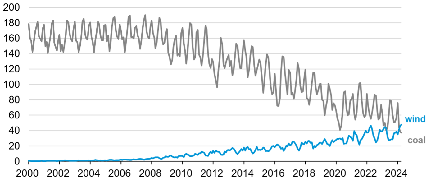 2. Monthly U.S. net electricity generation in TWh for coal and wind (January 2000–April 2024). Source: EIA