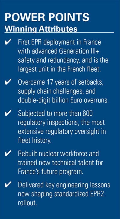 POWER’s Top Plant award rests on the project’s resolve and engineering persistence. While Flamanville 3 was launched in 2007, envisioning a 54-month schedule, the project unfolded over 17 years as French utility giant EDF, its suppliers, and France’s Nuclear Safety Authority (ASN) confronted issues that revealed how much nuclear construction expertise had faded since the country’s last wave of builds. Pressure-vessel anomalies, break-preclusion weld deviations, and documentation gaps repeatedly slowed progress. But each setback forced deeper quality control and gradual rebuilding of industrial capability that France will rely on as it rolls out the next generation of EPR2 reactors.