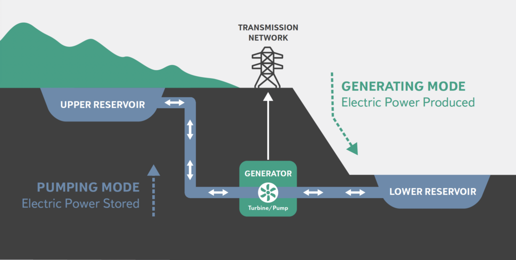 Pumped-hydro storage involves pumping water uphill when there is a power surplus on the grid, and then releasing it downhill, through generators, when more electricity is needed.