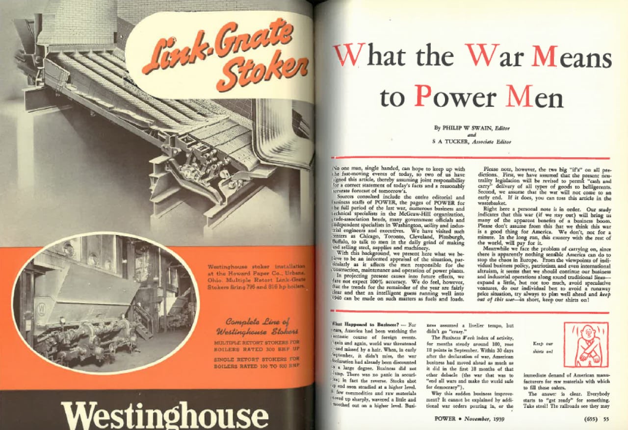 In November 1939, POWER’s Editor Philip Swain and Associate Editor S.A. Tucker published this extraordinary article about what a war could mean for the power business. “We present here what we believe to be an informed appraisal of the situation, particularly as it affects the men responsible for the construction, maintenance and operation of power plants.”