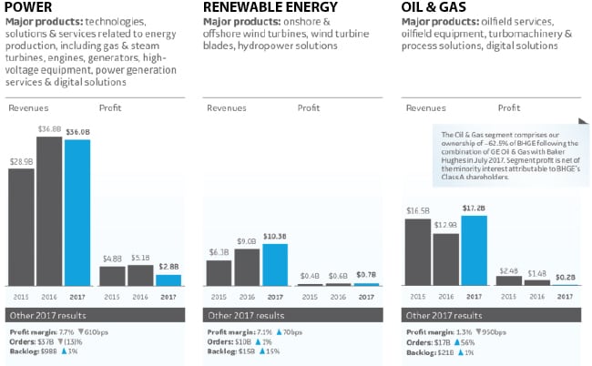 - Dismal earnings. Diminished profit margins from GE’s power unit were partly to blame for company financial results that were “significantly below … expectations” overall, GE said in its February 26-released 2017 Annual Report. GE’s other energy units also faced headwinds. The renewable energy unit got a boost from strong revenue and orders growth from wind turbine repowering projects, even if it grappled with increasing pricing pressure and a need for innovation owing to continued competitive pressure from other wind turbine producers and energy sources. The oil and gas segment’s profit margins hinged on a volatile oil market, but GE expects stabilization, forecasting “strength in short-cycle businesses driven by North America onshore activity.” Courtesy: GE, 2017 Annual Report, (GE 2017 Form 10-K)