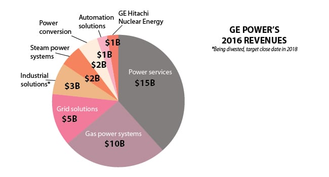 GE Power is made up of several lucrative business segments, which brought in a combined $26.8 billion in revenue for GE in 2016 (Figure 1). The sizable earnings are about 22% of the total $123.7 billion GE drew in last year from all its business units, but GE Power was GE’s highest-earning unit (followed closely by the Aviation business at $26.2 billion). At GE Power, meanwhile, the segments that bring in the most revenue are those dedicated to power services and gas power systems.