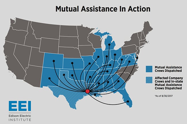 What Is Mutual Assistance?The U.S. power industry, connected by a common grid and a mission to keep the lights on, bands together to provide mutual assistance during disasters. According to the Edison Electric Institute (EEI), this voluntary partnership of companies across the country is a “hallmark of the electric power industry” serves as an effective—and crucial—restoration resource for power companies. The EEI says that with mutual assistance, which is an essential part of contingency planning, power companies impacted by a major outage event are able to increase the size of their workforce by “borrowing” restoration workers from other companies in unaffected areas. EEI member companies work through seven regional mutual assistance groups across the country, who are ready to provide assistance when needed. When called upon, a company will send skilled restoration workers—both company employees and contractors—along with specialized equipment to help with the restoration efforts of a fellow company. Harvey’s assault on the Gulf Coast region began on Friday. At least 70 repair crews were on the ground by Monday from other parts of Texas, Alabama, Florida, Kansas, Louisiana, and Tennessee. As of Wednesday morning, more than 10,000 workers from at least 20 states were attempting to restore power, the EEI said. |