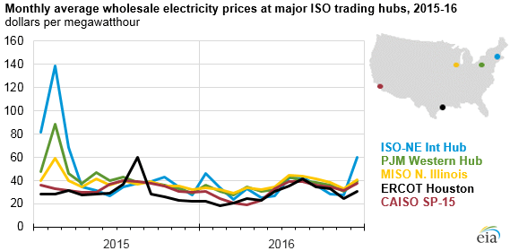 3. How ERCOT compares. Average wholesale power prices at  major trading hubs across the U.S. were significantly lower in 2016 than in 2015. This was primarily driven by the sustained low cost of natural gas, a fuel that often determines the marginal generation cost in most power markets. Source: EIA/SNL Energy
