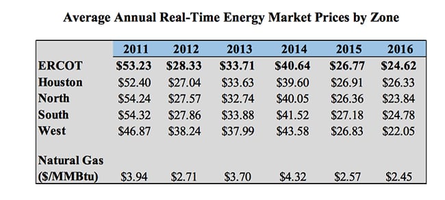 2. The price drift. In its “2016 State of the Market Report” published earlier this year, Potomac Economics, ERCOT’s independent market monitor, said the average annual real-time energy market price decline is largely pegged to “lower natural gas prices and surplus supply.” Courtesy: Potomac Economics