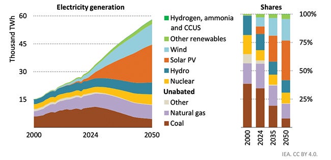 1. Global electricity generation by source in the International Energy Agency’s (IEA’s) Stated Policies Scenario (STEPS) to 2050. The electricity mix shifts steadily away from fossil fuels toward solar photovoltaic (PV) and wind, with renewables surpassing fossil generation by 2035 and continuing to expand through 2050, while nuclear maintains a stable contribution across the period. Source: IEA, World Energy Outlook 2025 |