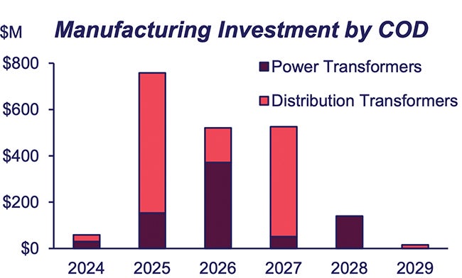 1. Market impacts identified by Wood Mackenzie include escalating competition for factory slots, rising equipment prices, and multi-year lead times for large transformers—conditions that have triggered nearly $1.8 billion in new North American manufacturing investments, shown here by expected commercial operation date (COD). Courtesy: Wood Mackenzie, Making the Connection: Meeting the Electric T&D Supply Chain Challenge (Sept. 2025) |
