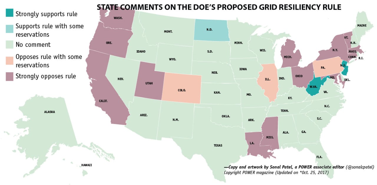 While part of a multi-state filing opposing the rule (*see below), Connecticut Attorney General George Jepsen separately said the rule could require new tariffs requiring operators of organized markets to ensure that certain reliability and resiliency attributes are fully valued, and could have a dramatic effect on power prices in New England. The state’s Public Utilities Regulatory Authority and other agencies also opposed the rule in their own filing, saying it doesn’t give anyone the meaningful opportunity to comment, and that it infringes upon state jurisdiction over generation facilities.