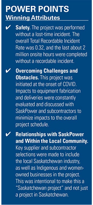 Said Gander, “Even as restrictions were lifted, the labor market never fully rebounded, with estimates upwards of 10% for permanent departures in the workforce in Saskatchewan. This created challenges in labor attraction, requiring the team to maintain a high level of transparency with SaskPower and work closely with them to develop appropriate action plans. Despite these obstacles, the team was able to draw on its familiarity with subcontractors and prior experience working in Saskatchewan to help manage and mitigate many of the challenges.”